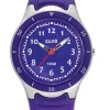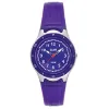 kinder horloge van Club time model A47103PU10A met plaat van paarse, lichtgevend cijfer en wijzer.