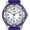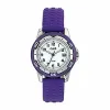 Het horloge heeft een bandje van paarse rubber.