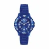 Het horloge heeft een bandje van blauw metallic siliconen.