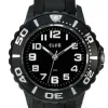 Het horloge heeft een bandje van zwart rubber.