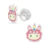eenhoorn kristal oorsteker in zilver met glanzend oppervlak en 6 facetgeslepen witte kristallen en glad roze emaille en glad lichtgeel emaille en glad lichtblauwe emaille en glad zwart emaille.