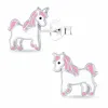 eenhoorn kinder oorbellen in zilver met glanzend oppervlak en glad witte emaille en briljantgeslepen pink emaille en glad zwart emaille.