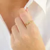 groen kristal ring in verguld messing met glanzend oppervlak en 3 facetgeslepen lichtgroene kristallen en 4 facetgeslepen groene kristallen.
