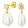 parel oorbellen in verguld messing met mat oppervlak en 2 facetgeslepen witte zirkonen 2 witte parels.