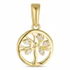 9,5 mm boom van het leven zirkoon hanger in 8 karaat goud met glanzend oppervlak en 5 facetgeslepen witte zirkonen.