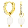 waterproof parel oorbellen in verguld staal met glanzend oppervlak en facetgeslepen witte zirkoon 2 witte synthetische parels.